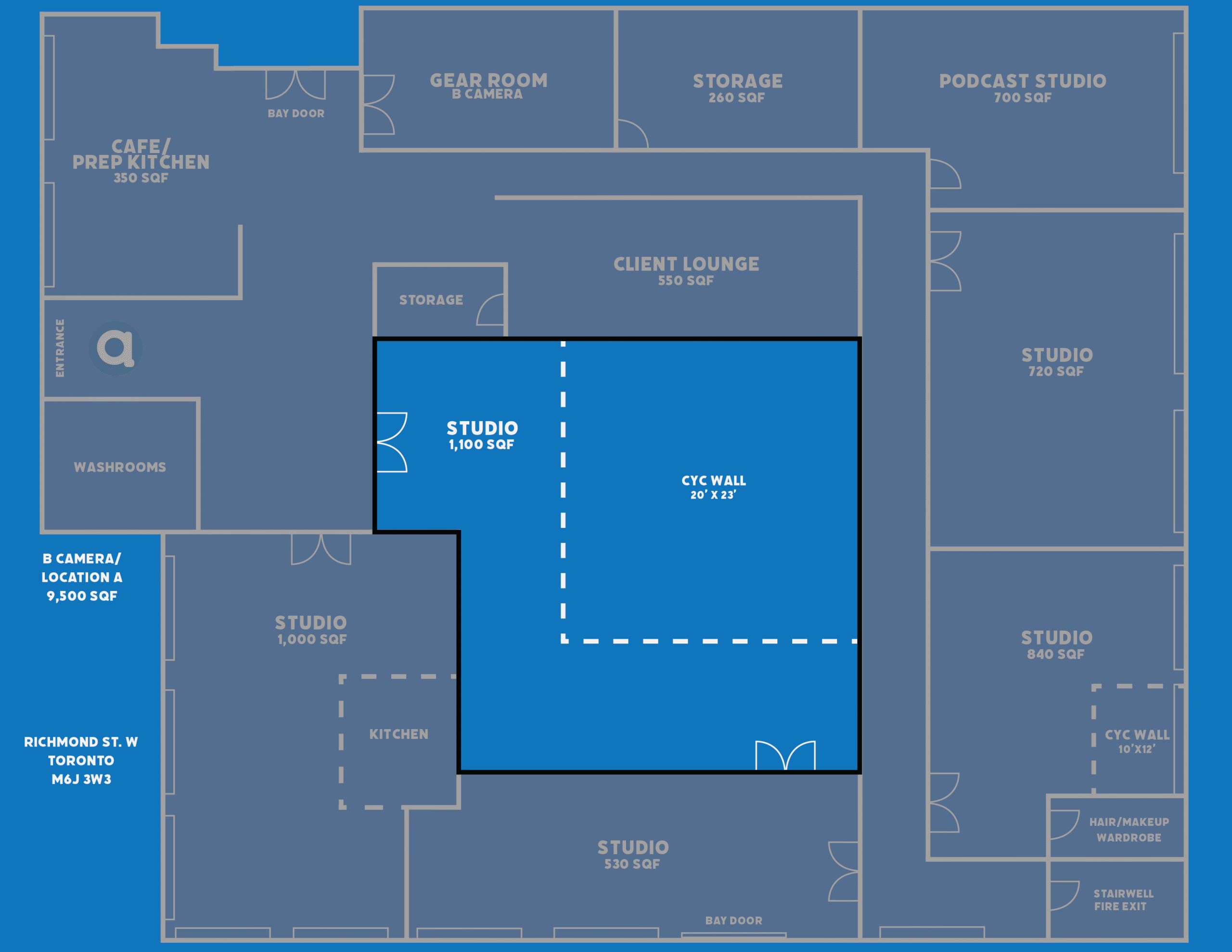 A 1,100-square-foot, sound-controlled studio tailored for high-end photo and video production. With full blackout capability and 12-foot ceilings, it features a 20×23-foot cyclorama wall that provides a seamless background for clean, professional visuals. The studio also includes a direct video feed to the lounge, allowing clients, crew, or collaborators to monitor shoots in real time from a comfortable viewing area. This setup makes Location A ideal for interviews, commercial content, and productions that demand both visual precision and audio isolation.